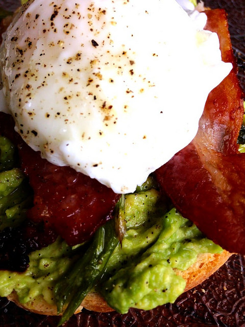 Toast your toast, roast your asparagus and your bacon (400 degrees for 19 minutes is my own oven’s sweet spot for perfect bacon) on the same cookie sheet to save on dishes, mash your avocado while the bacon crisps, and then poach one egg to put right on top. When you break the egg and the golden yolk hits all that delicousness underneath? Bliss.